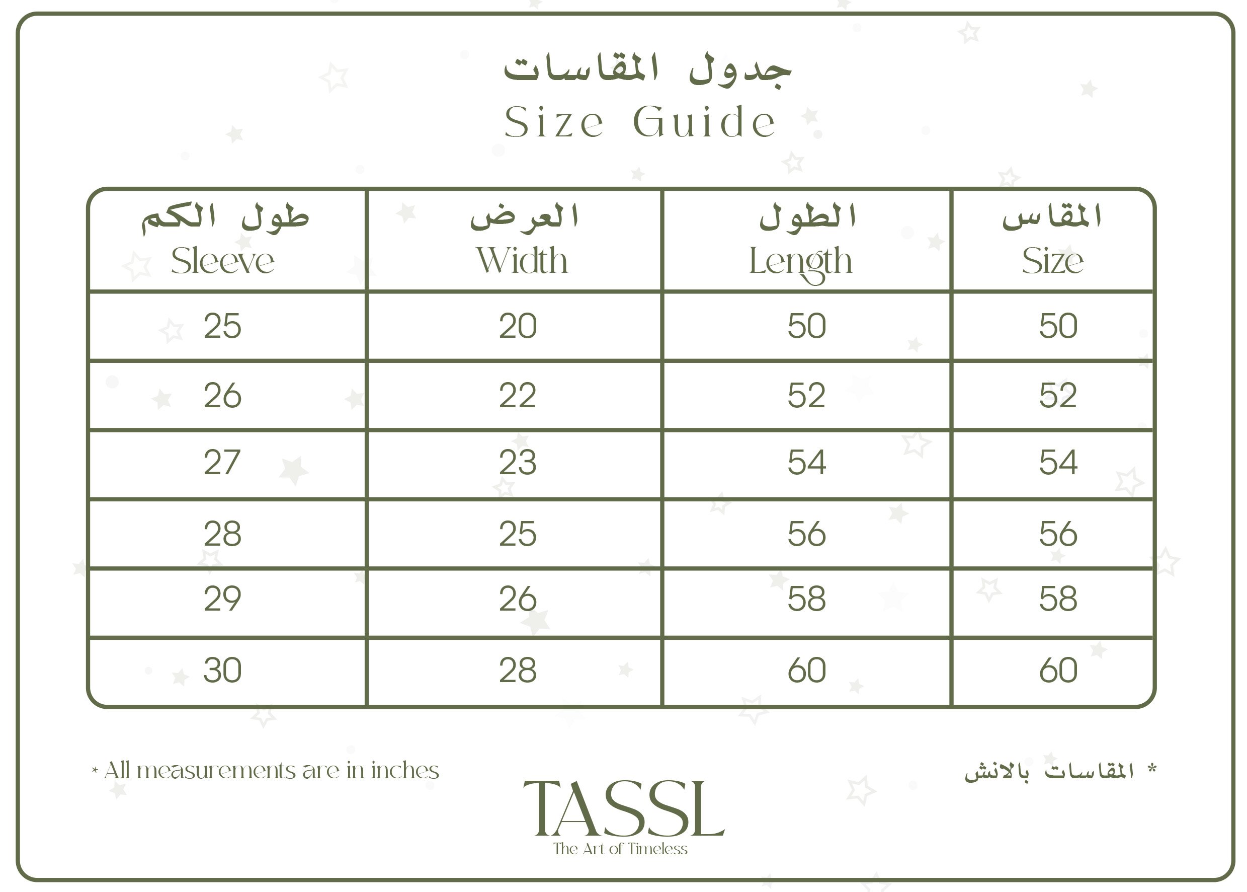 جدول المقاسات