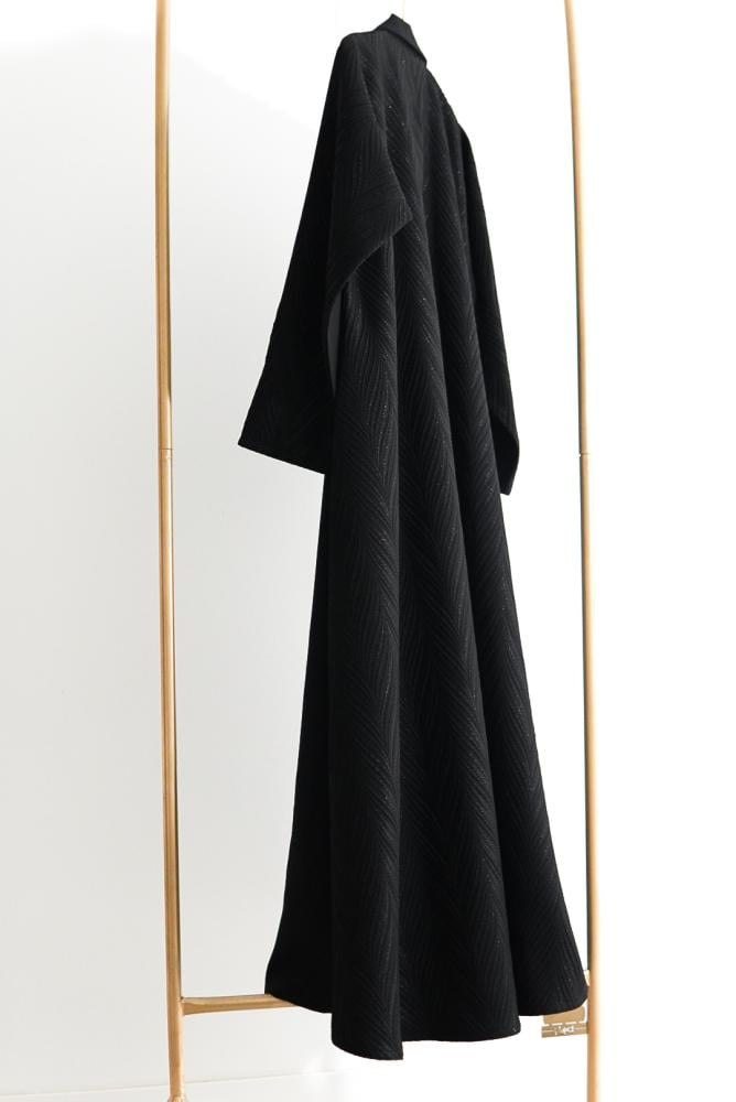 عباية كريب ملكي 103 من TASSL بخامة فخمة جداً بلون أسود فاحم. الخلفية جاكار تضيف لمسة رقي وتخلي العباية خيار مثالي لمناسباتك الخاصة وإطلالاتك المميزة.
